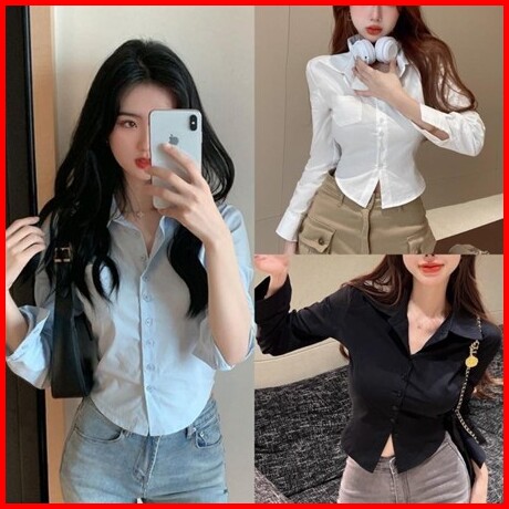 Dnara - Fuji Kemeja Crop Top Korean Style Kemeja Wanita Lengan Panjang Bahan Stretch Slim Fit