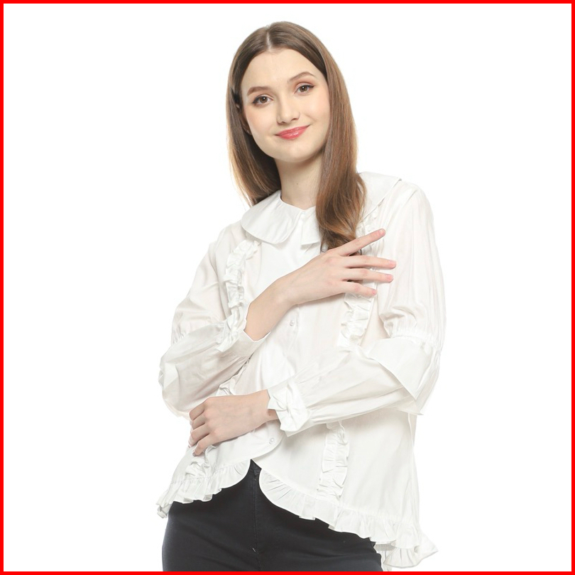 Senchi - Ayaka Ruffle Pearl Button Shirt Atasan Kemeja Frill Style Jepang Korea Kemeja Ruffle Lucu Wanita