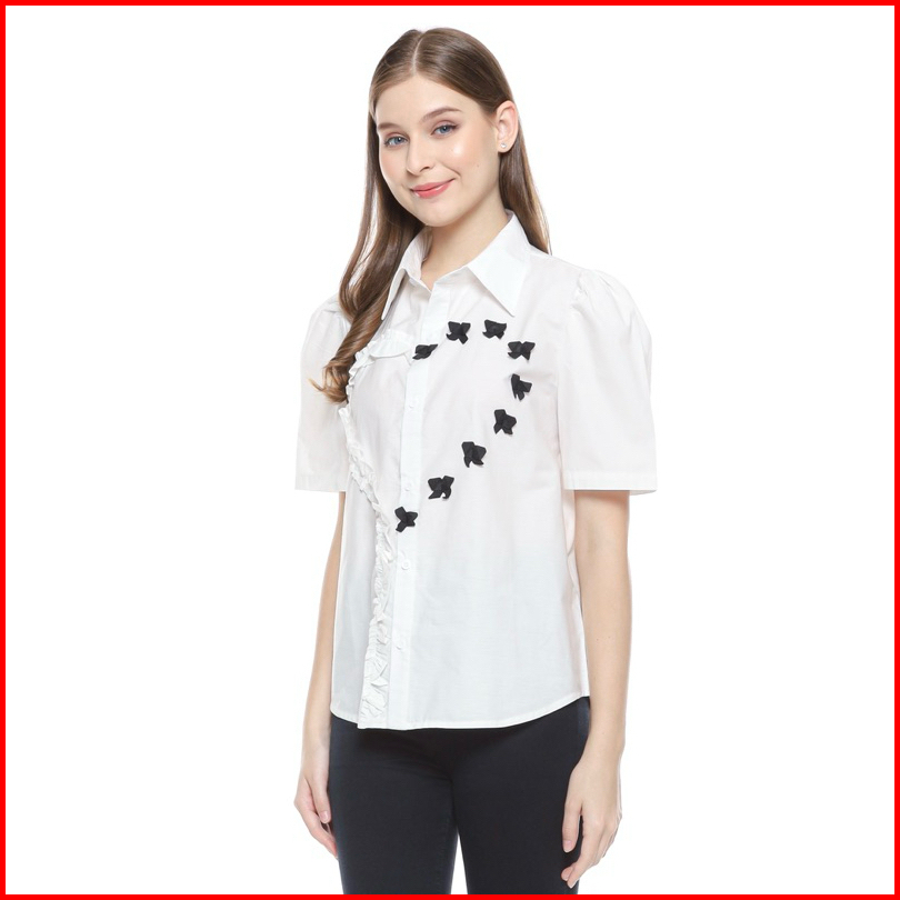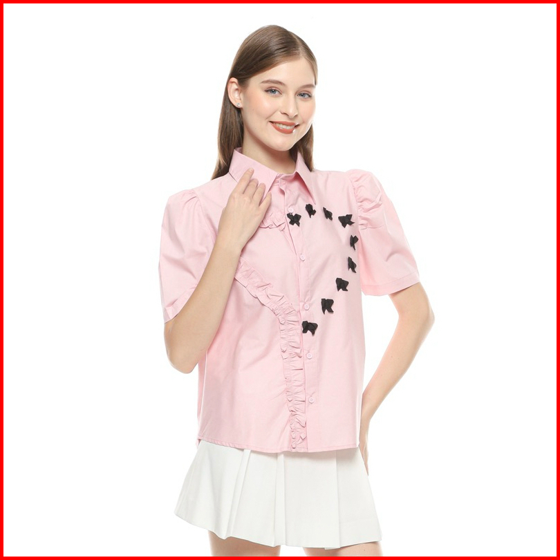 Senchi - Kokoro Heart Shirt Atasan Kemeja Lengan Pendek Atasan Kemeja Hati Love Heart Lucu Atasan Kemeja Pita Ruffle Luc
