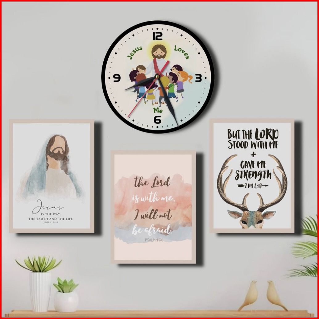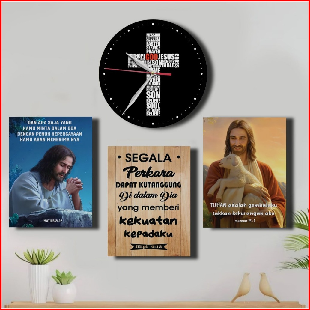 Best Seller Jam Dinding Kayu Dekorasi Katolik Walldecor Gambar Yesus Ayat Alkitab Set 4 Pc