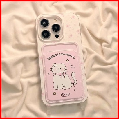 Case Iphone 11 12 13 14 15 Pro Max Xr Casing Softcase Card Slot Tali Lanyard Gelang Kitten Bowknot