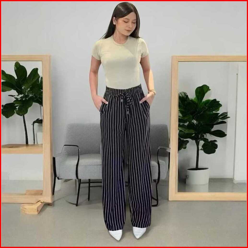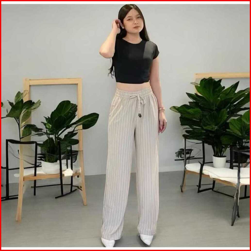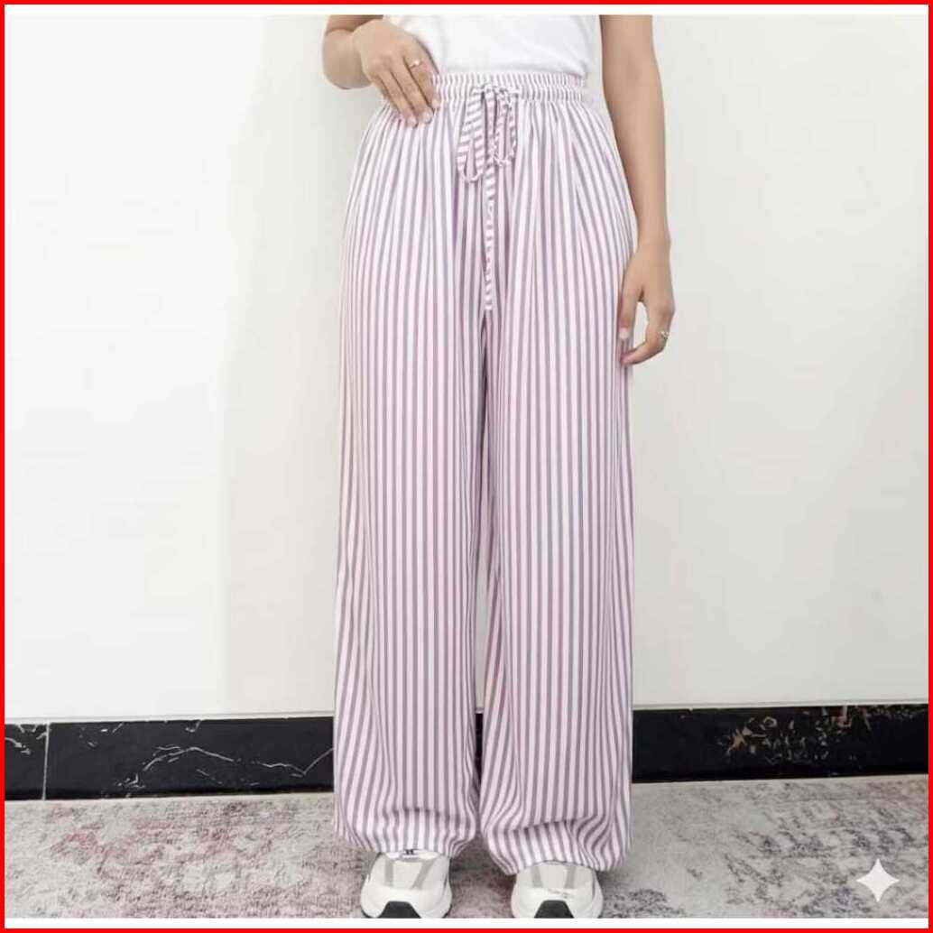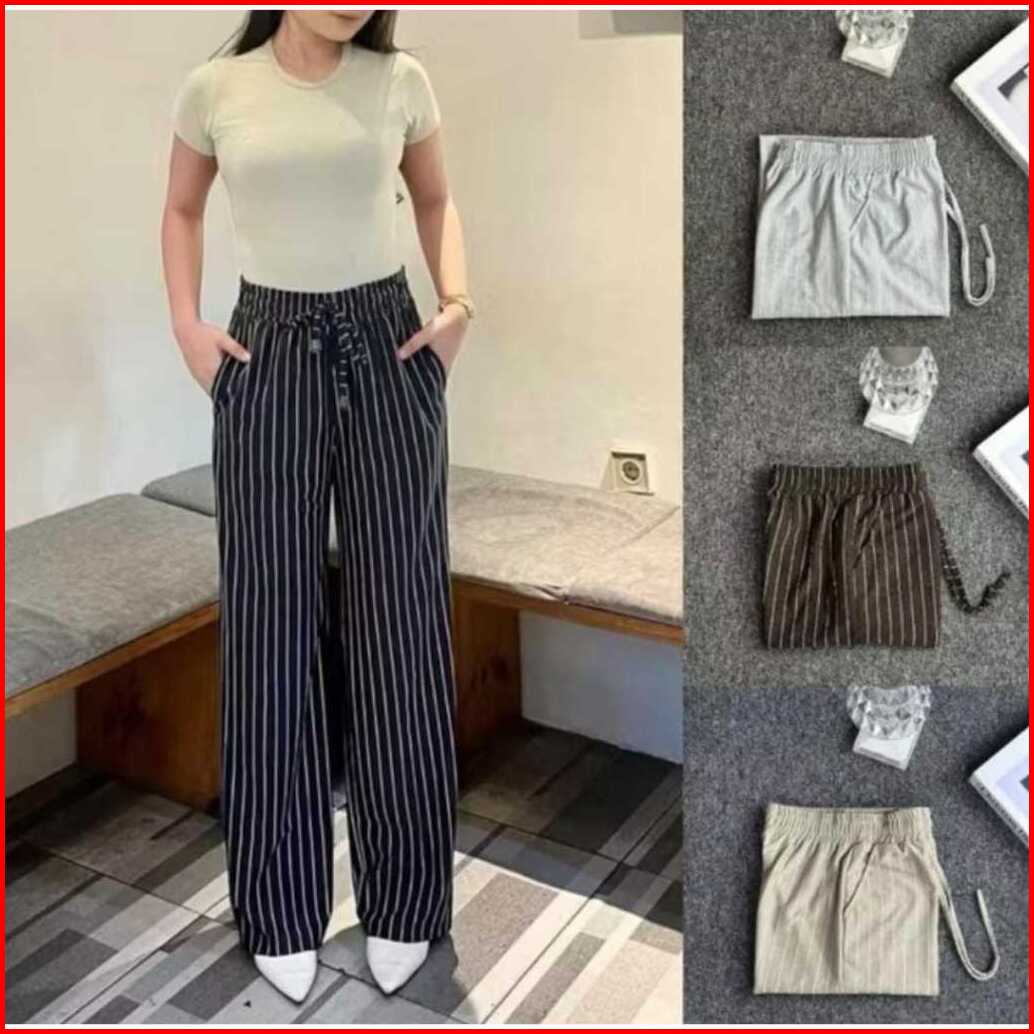 Rfa Stripe Pants Bangkok - Celana Panjang Rayon Wanita Baggy Kantor Kuliah Motif Garis Kulot Pinstripe - Celana Formal C