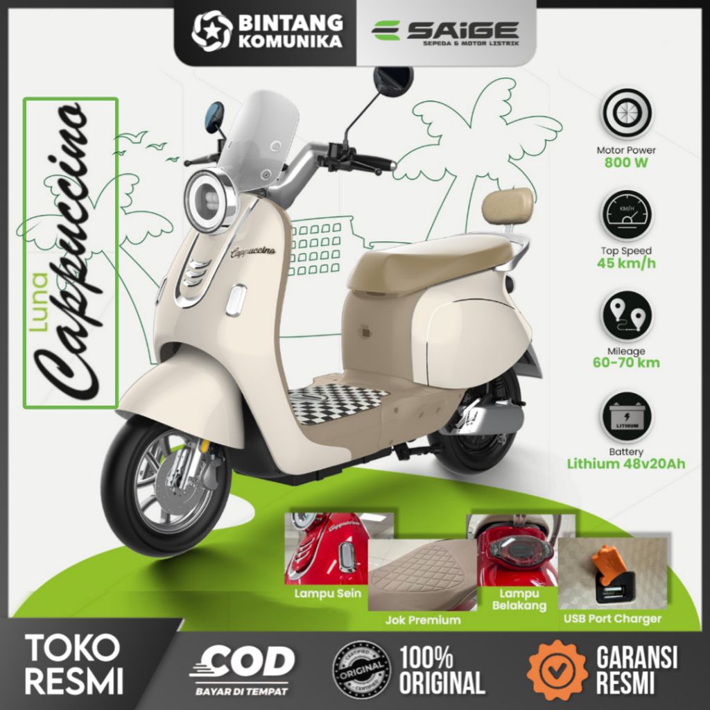 sepeda listrik saige luna cappuccino lithium batrei 800watt, jarak tempuh 70km original