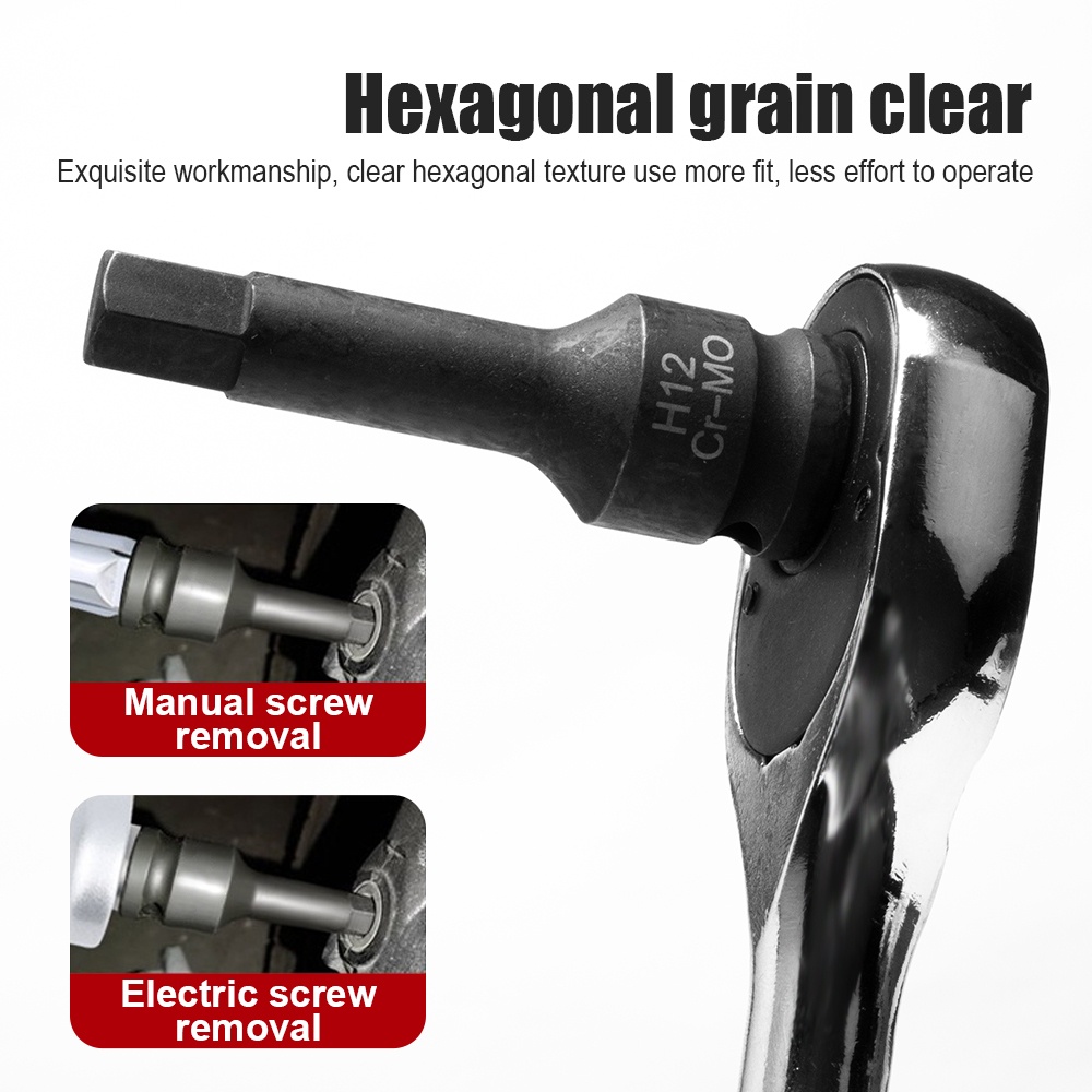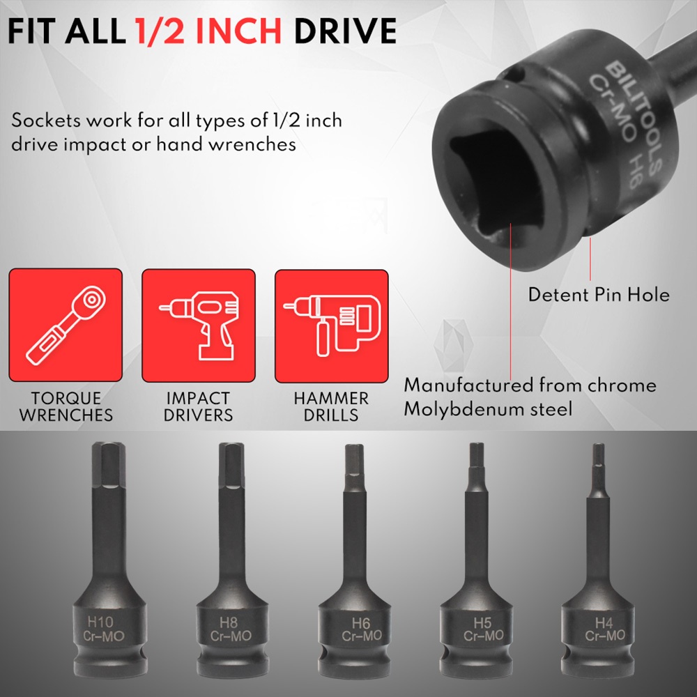 JLD 10Pcs Mata Kunci Shock H4 H5 H6 H8 H10 H12 H14 H16 H17 H19 Heavy Duty CR-MO Mata Sok Impact 1/2 Hex Bit Set Socket