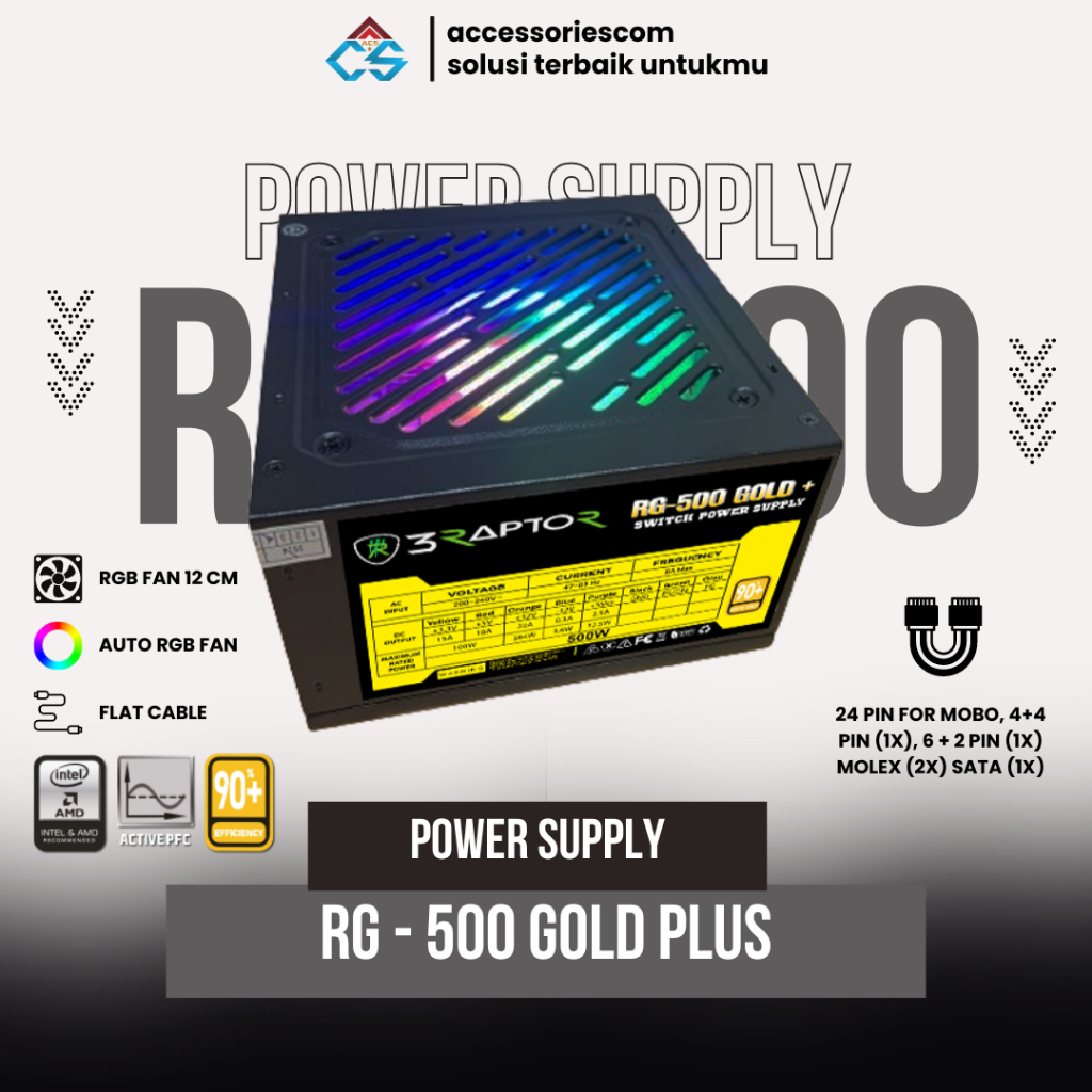 Power Supply PSU Gaming 3 RAPTOR RG-500 G-Old+ 500 Watt Fan RGB