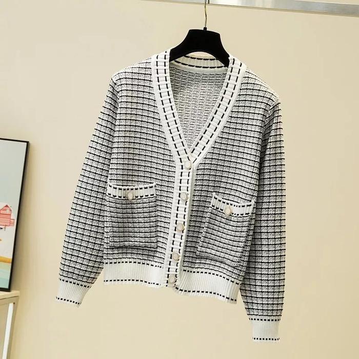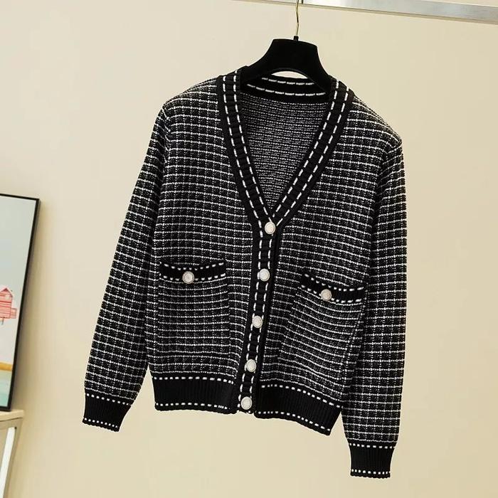 CARDIGAN KARDIGAN RAJUT RUBIK V NECK KNITWEAR WANITA BAJU GARIS - HITAM, ALL SIZE