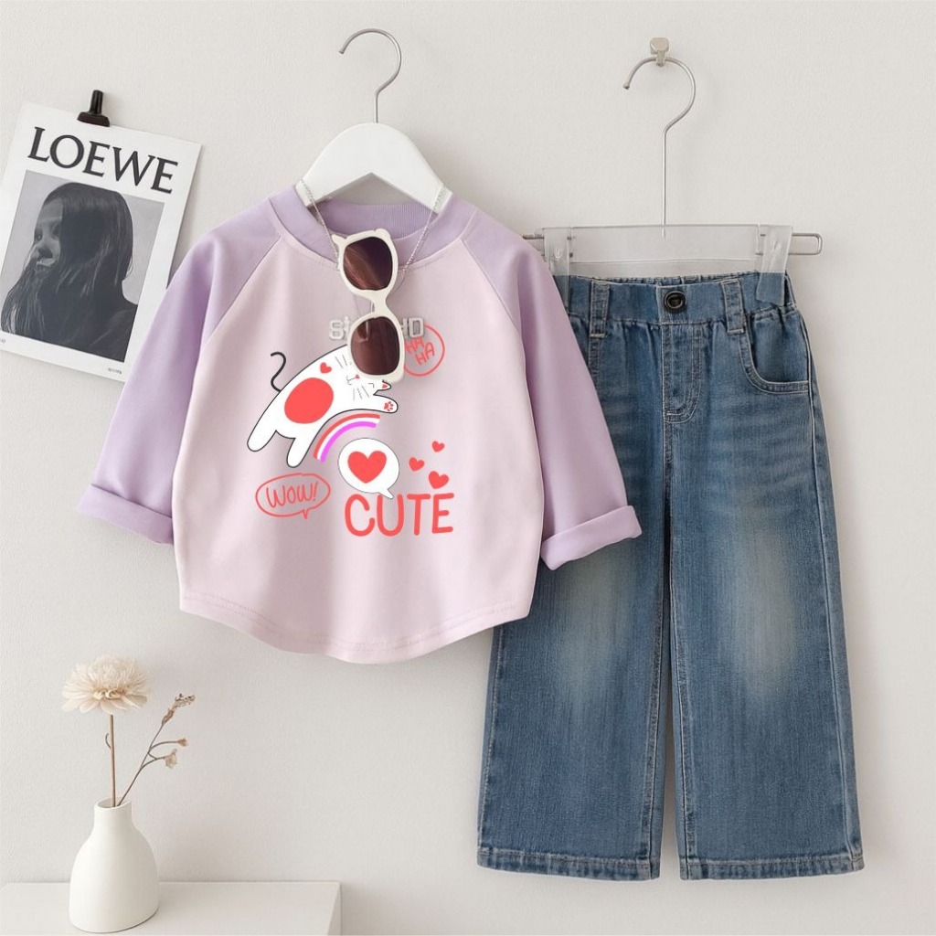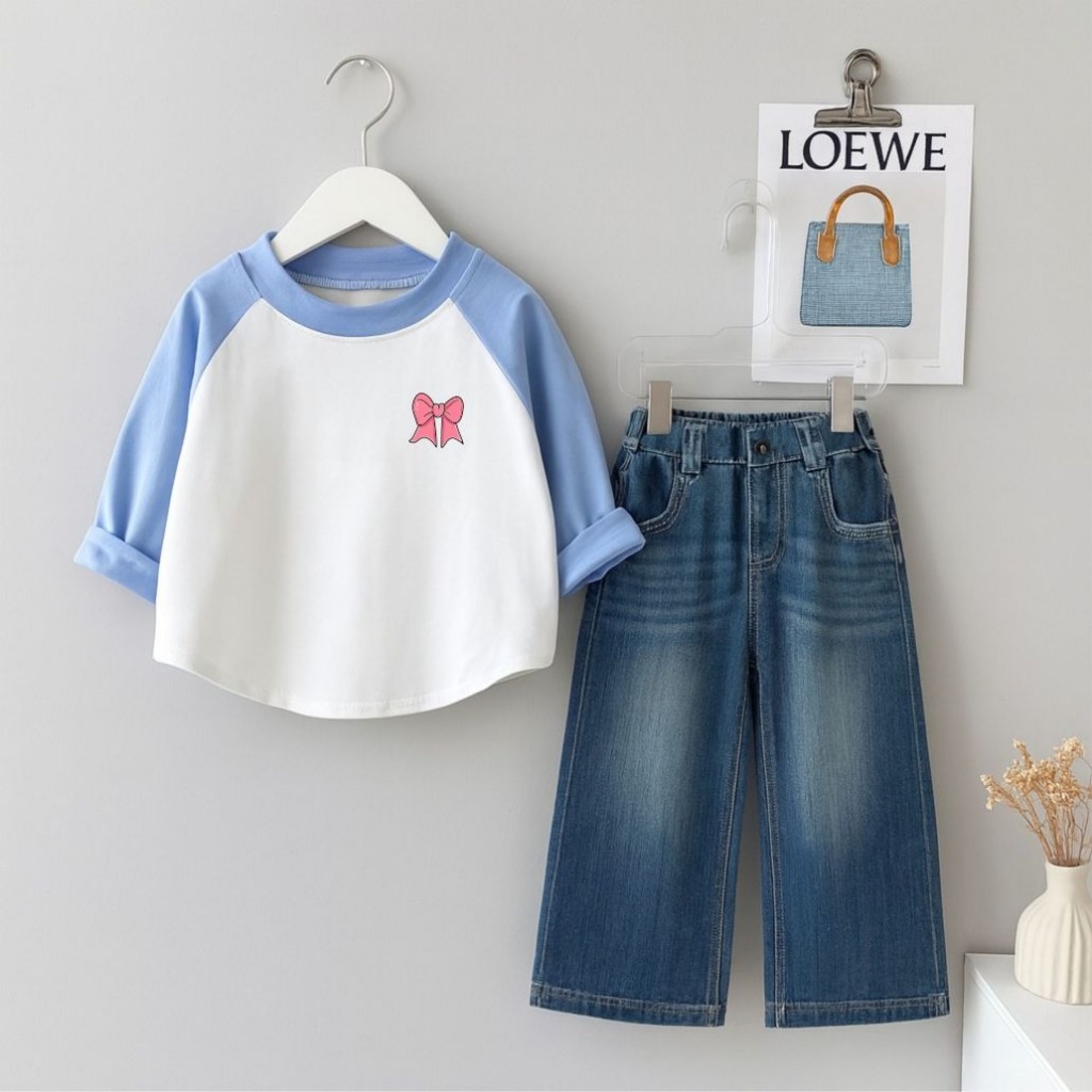 Setelan Baju Anak Kaos Raglan Lengan Panjang + Celana Jeans Denim Lebar Unisex Anak Perempuan Laki Laki Usia 1-12 Tahun