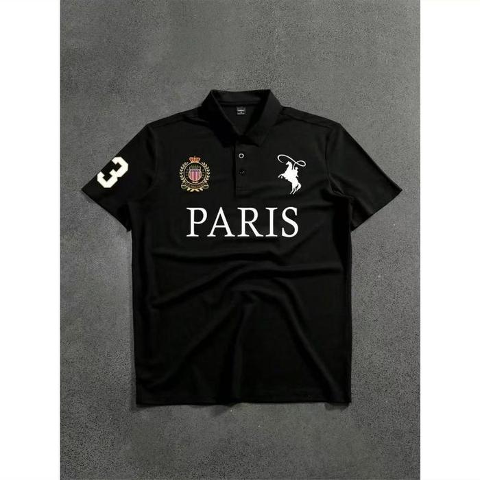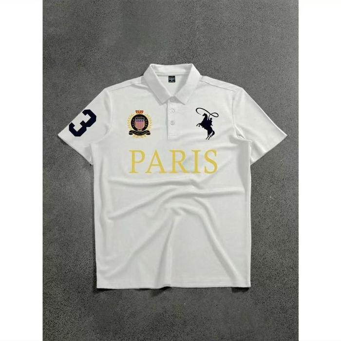 TRENDY AMERICAN-STYLE RETRO MEN'S POLO SHIRT, PARIS LETTER EMBROIDERY WITH POLO LOGO, COLLARED SHORT SLEEVES, STREET-STYLE LOOSE CASUAL FABRIC MENSWEAR POLYESTER LINGERIE TROPICAL - WHITE, M