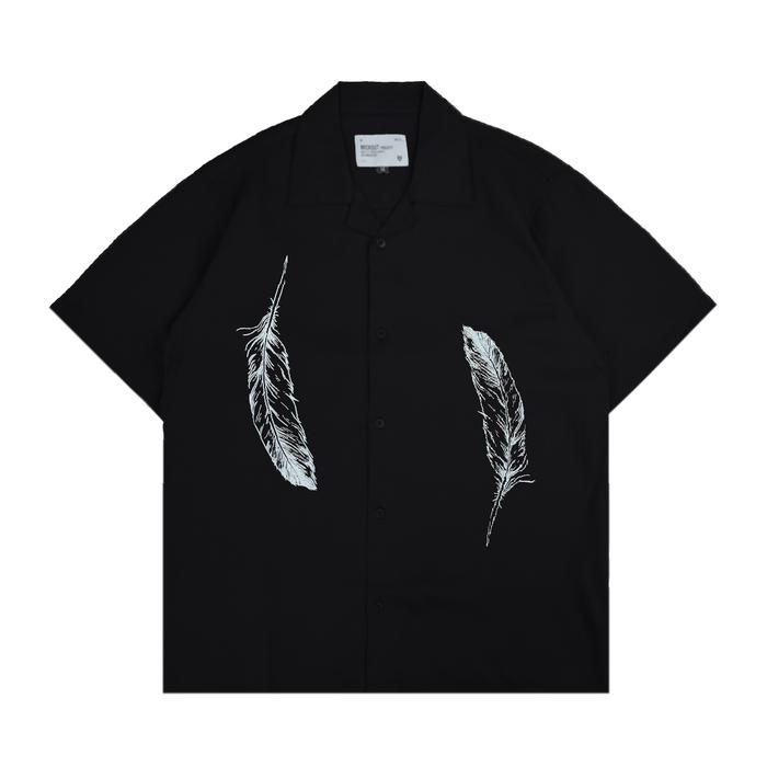 MICKOUT FEATHERS CASUAL SHIRT - KEMEJA KASUAL PRINT PRIA KATUN RAYON RELAXED FIT LENGAN PENDEK - HITAM - HITAM, M