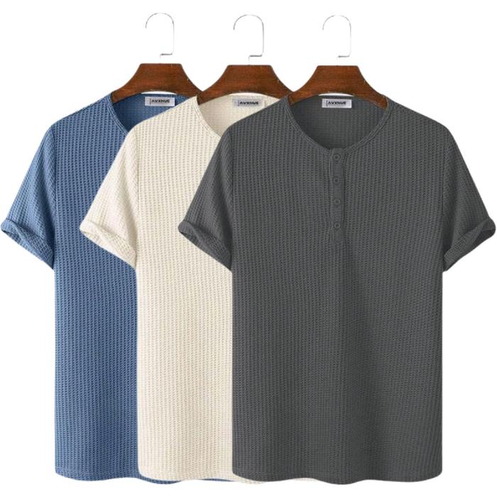 PAKET HEMAT 3 PCS KAOS HENLAY POLOS PRIA BAHAN WAFLE PREMIUM LEMBUT - KANCING MAYHEM - HITAM CREM DENIM, M