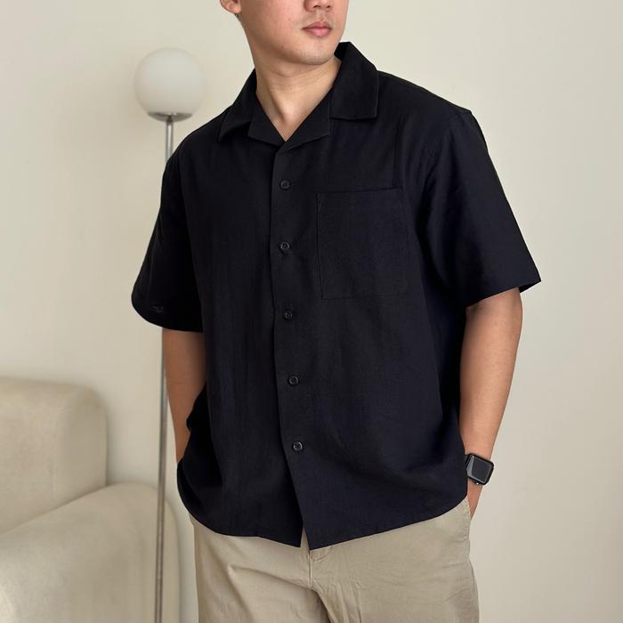 COZYCLUB CUBAN BOWLING SHIRT LINEN PREMIUM | KEMEJA BOWLING KERAH TERBUKA LENGAN PENDEK BAJU DARK GREY PANJANG - BLACK, S