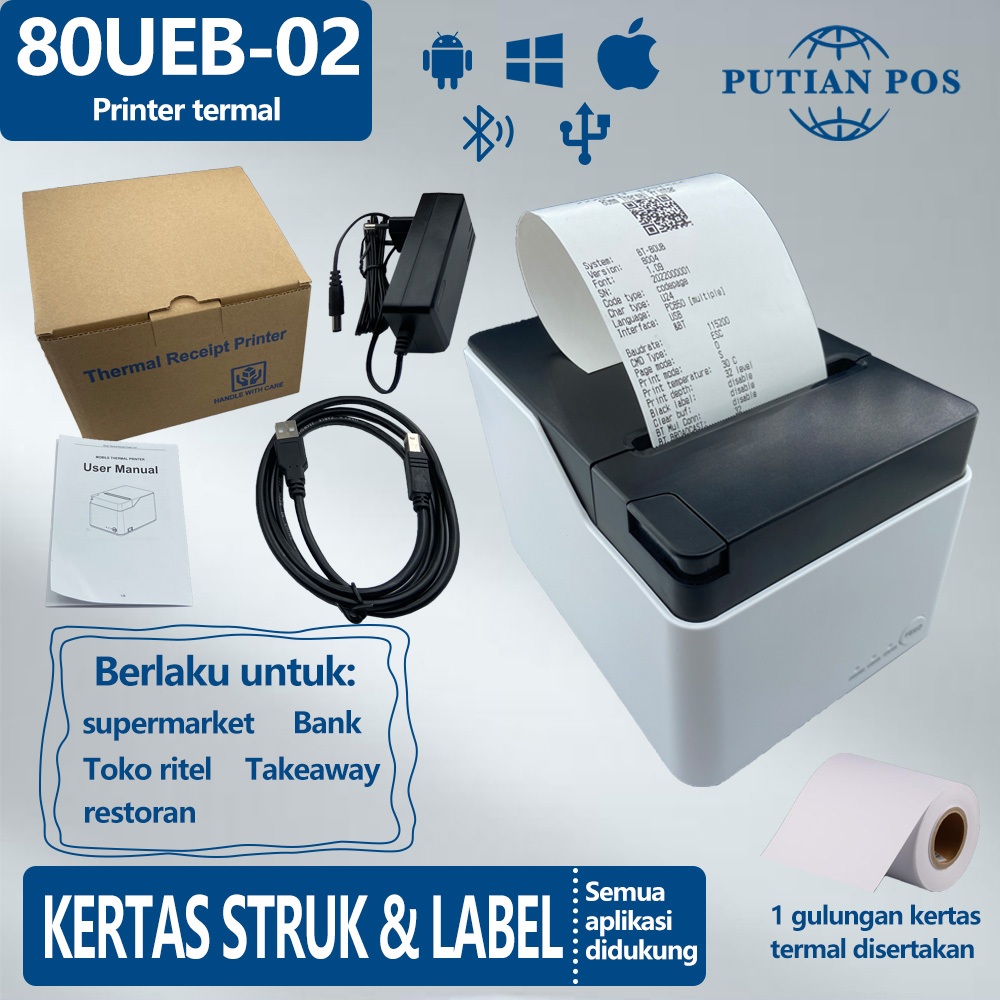 Desktop 58/80mm Printer Termal PUTIAN POS 80UEB-02 Koneksi USB Bluetooth, Pemotongan Otomatis