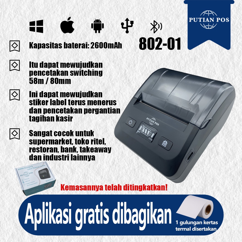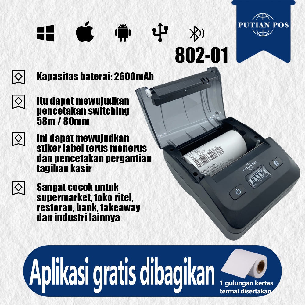 PUTIAN POS Stiker Label Printer Termal / Tanda Terima Printer 2-in-1 802-01 Printer Termal