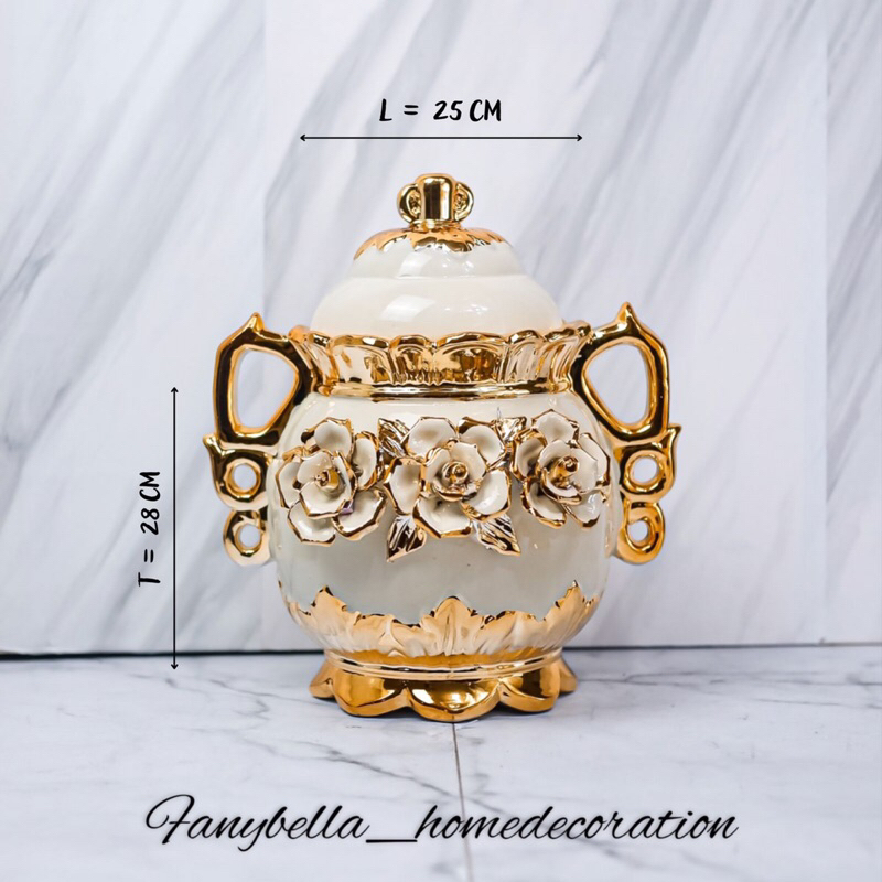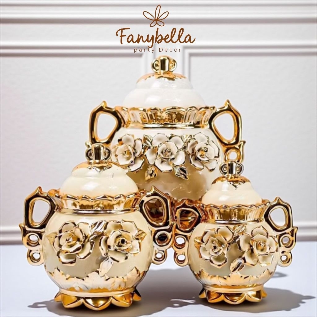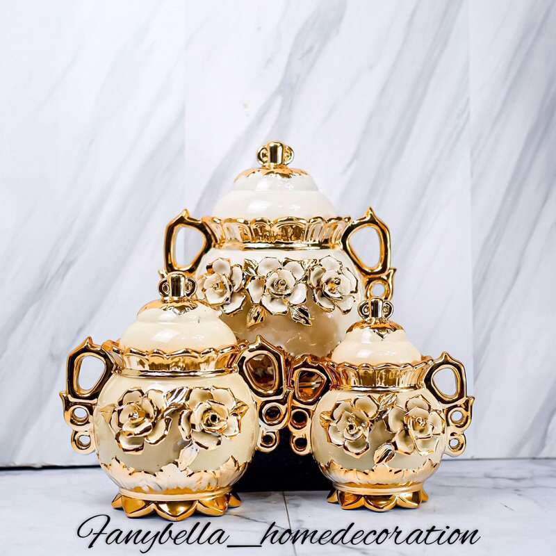 Pajangan Toples Vas Bunga Keramik Emas Gold Import Satu Set motif Bunga Dekorasi Rumah| FANYBELLA