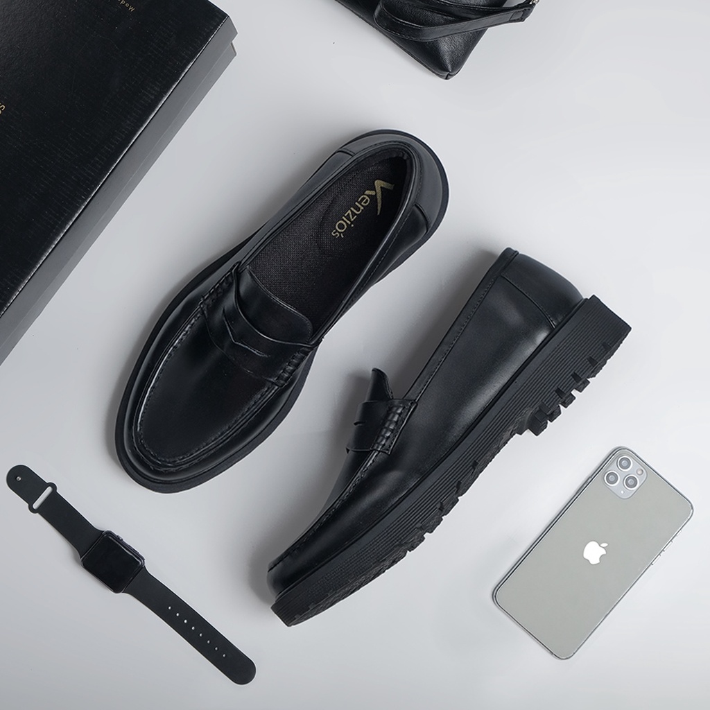KARN BLACK ORIGINAL x KENZIOS Sepatu Kulit Sapi Asli Pria Loafers Hitam Formal Kerja Kantor Slip On Docmart Slop Resmi