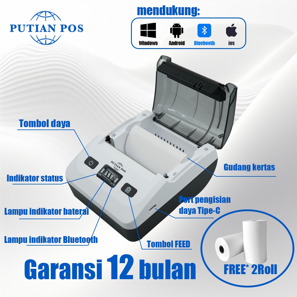 Printer Termal Bluetooth Portabel PUTIAN POS 80mm PUTIAN802 Printer Label Stiker (dengan Baterai)