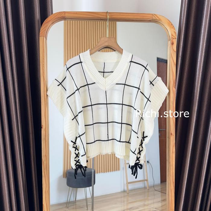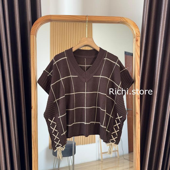 JENNA VEST CROP RAJUT ATASAN WANITA PENDEK KNITWEAR ROMPI KOTAK TALI SERUT - KHAKI