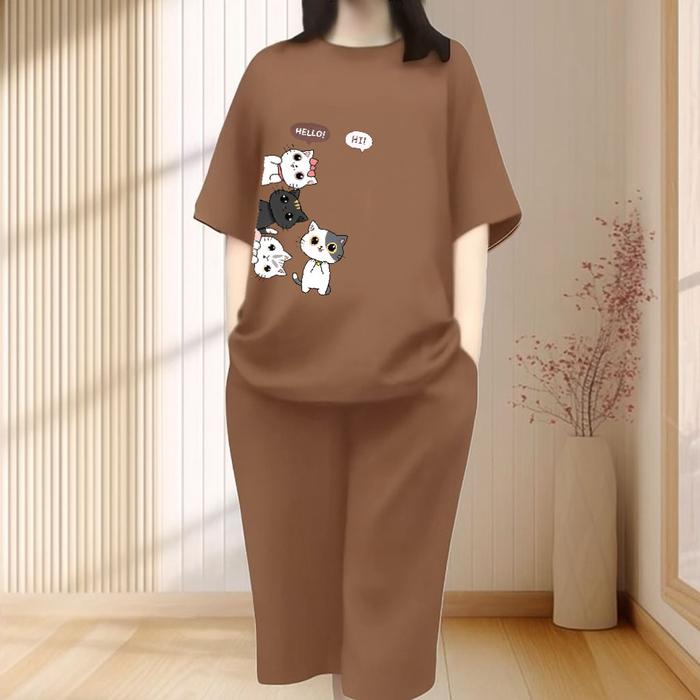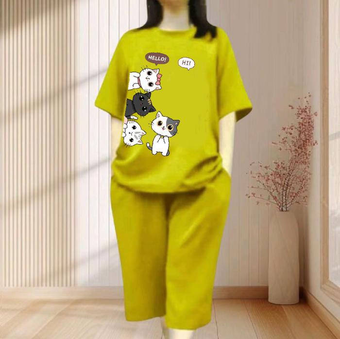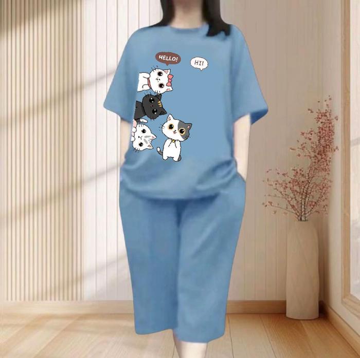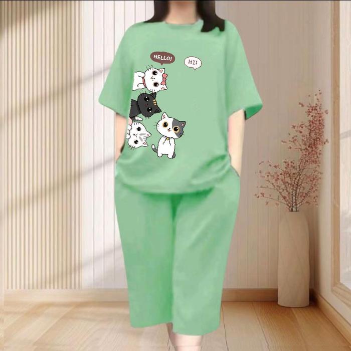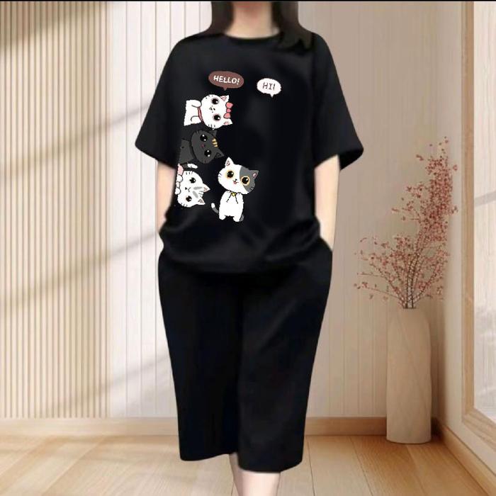 SETELAN KULOT DEWASA MOTIF " CAT SIDE " BAHAN BABYTERR PREMIUM CELANA7/8 - HITAM, M (BB 45-55KG)