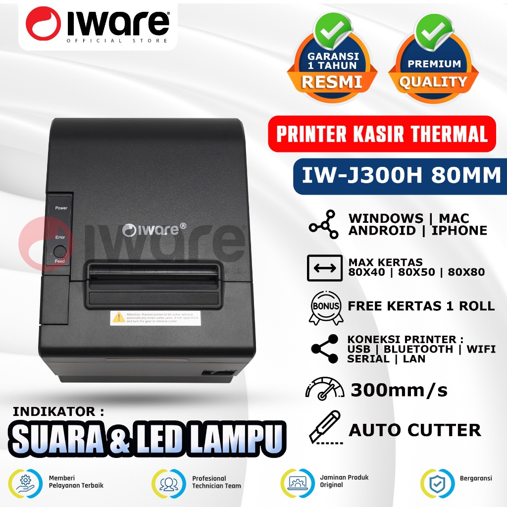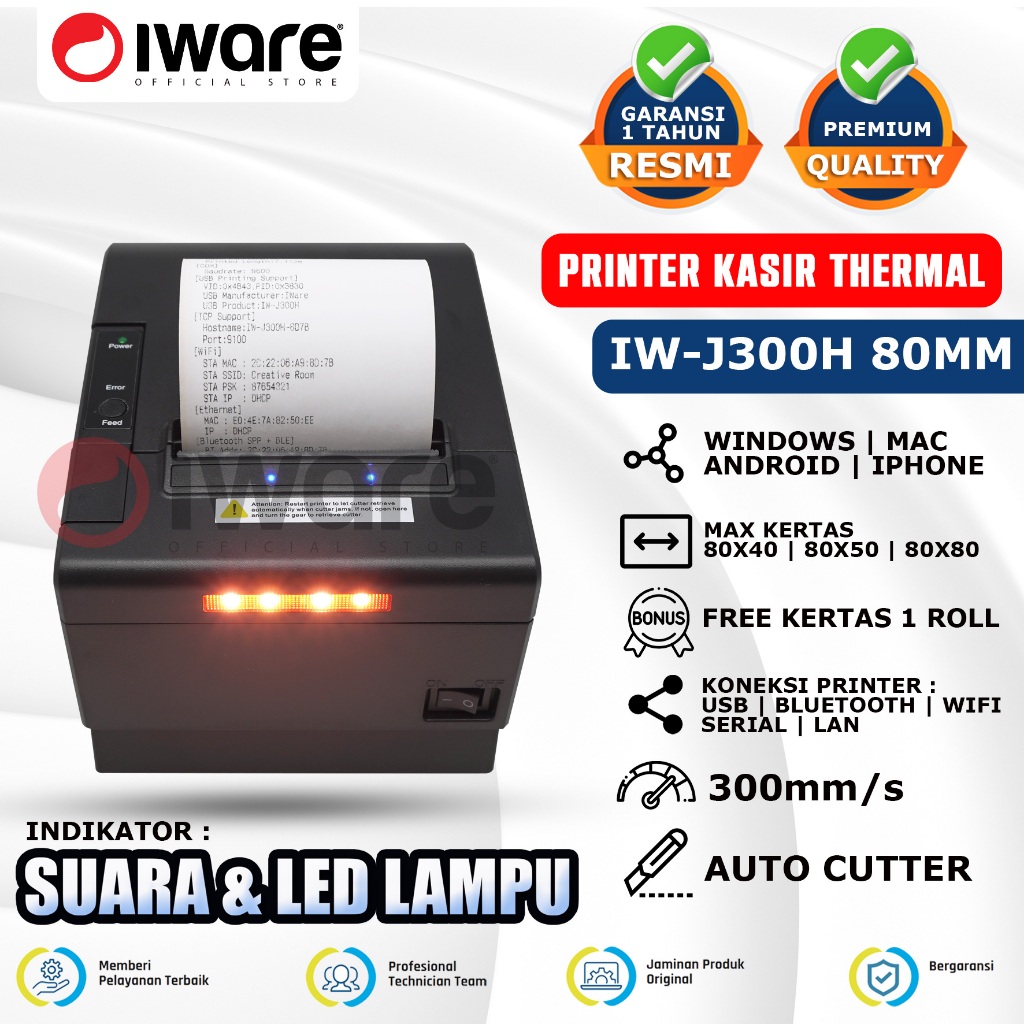 Iware Printer Thermal Kasir IW-J300H 80mm Autocutter Alarm Kitchen Usb Lan Serial Wifi Bluetooth Led Indikator Suara