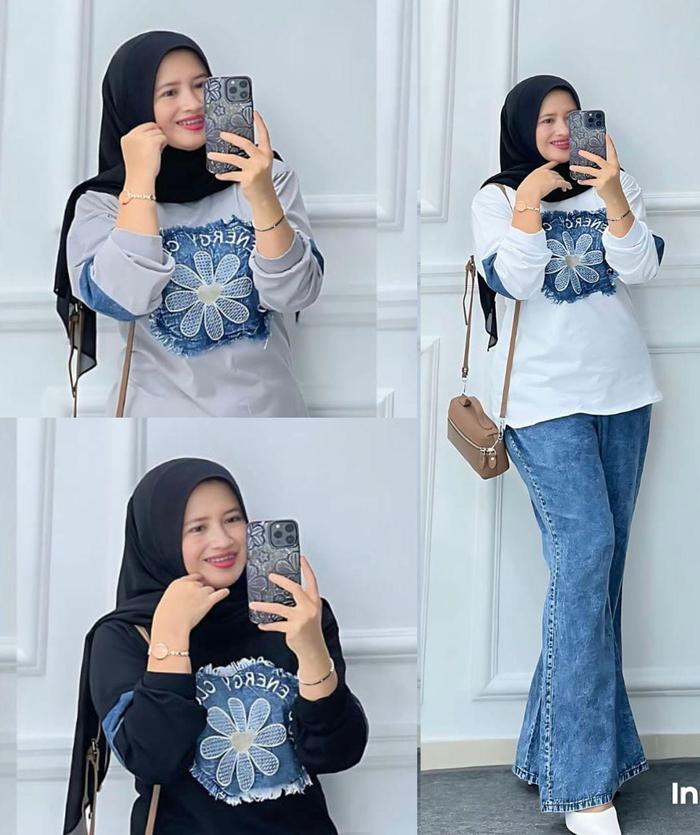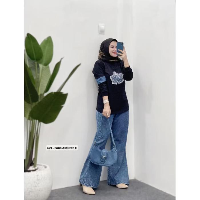 SETELAN JEANS MIX KAOS WANITA PREMIUM BAJU COMBED CASUAL NYAMAN DENGAN LINGKAR DADA 110-120 CM CELANA JEANS BERKUALITAS
