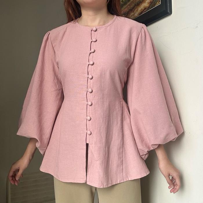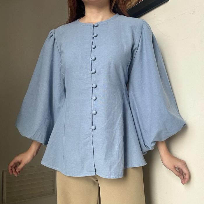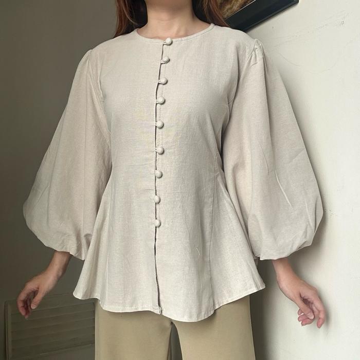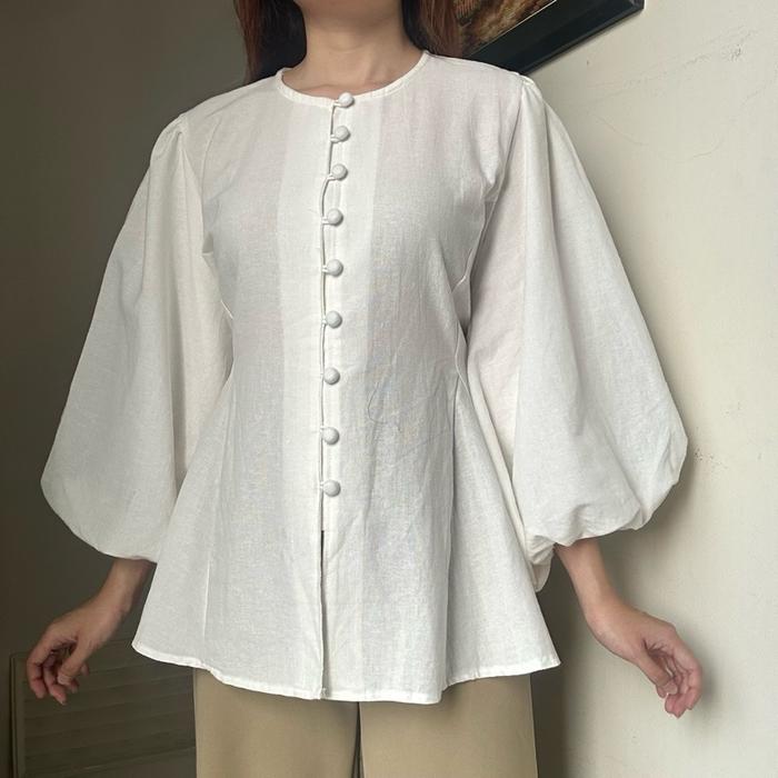 ASTRID T0P ATASAN KEMEJA BLOUSE WANITA KERJA LINEN TANGAN BALON PANJANG KOREAN STYLE BY BIEL THE LABEL - PUTIH