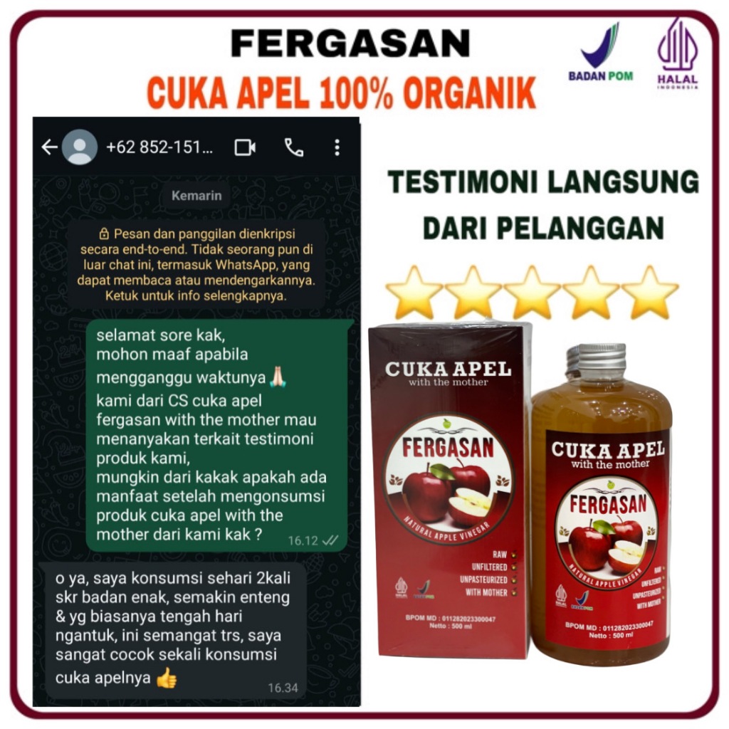 Cuka Apel Fergasan Original & 100 PERSEN Organik, Diet Detoks, Kesehatan, Apple Cider Vinegar, with Mhoter