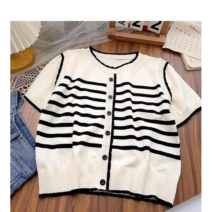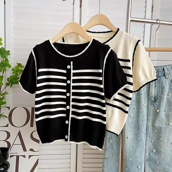 - BLOUSE SALUR ATASAN WANITA LENGAN PENDEK ATASAN KNIT STRIPED BAHAN RAJUT KANCING VARIASI - HITAM