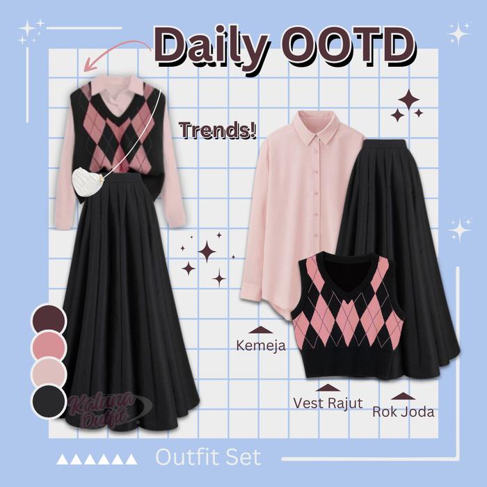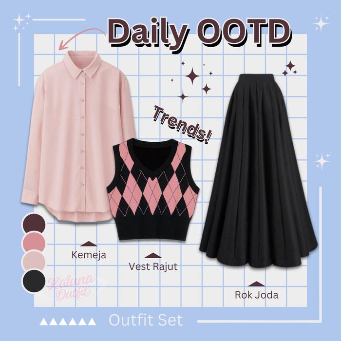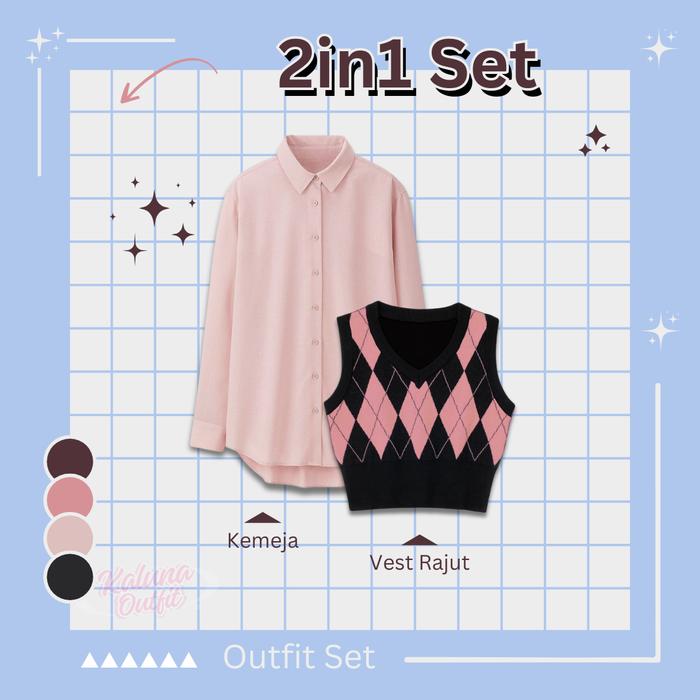 3IN1 ONE SET KOREAN STYLE KOMBINASI ATASAN KEMEJA BASIC PINK VEST RAJUT daymen ROK JODA PANJANG SETELAN NONGKRONG KO1D