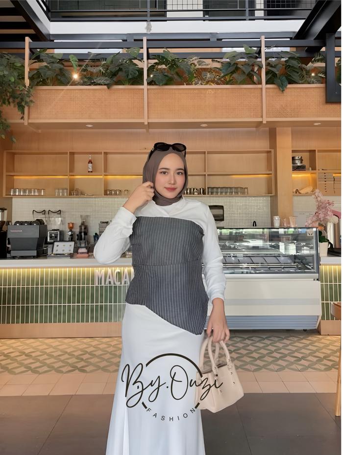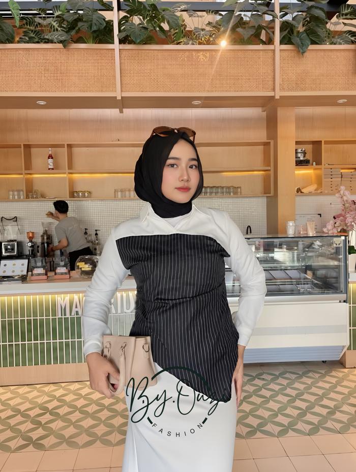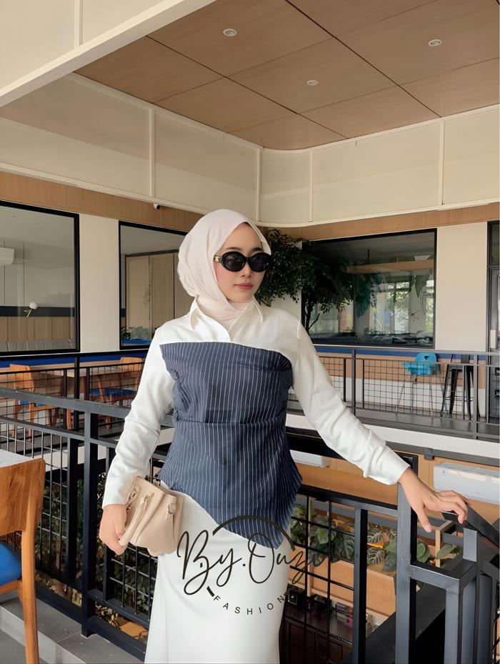 BY.OUZI KEMEJA LENGAN PANJANG SEMIWOOL HANAMI ATASAN T0P WANITA FIT BODY DENGAN AKSEN SALUR ASIMETRIS & KERAH KLASIK TAM
