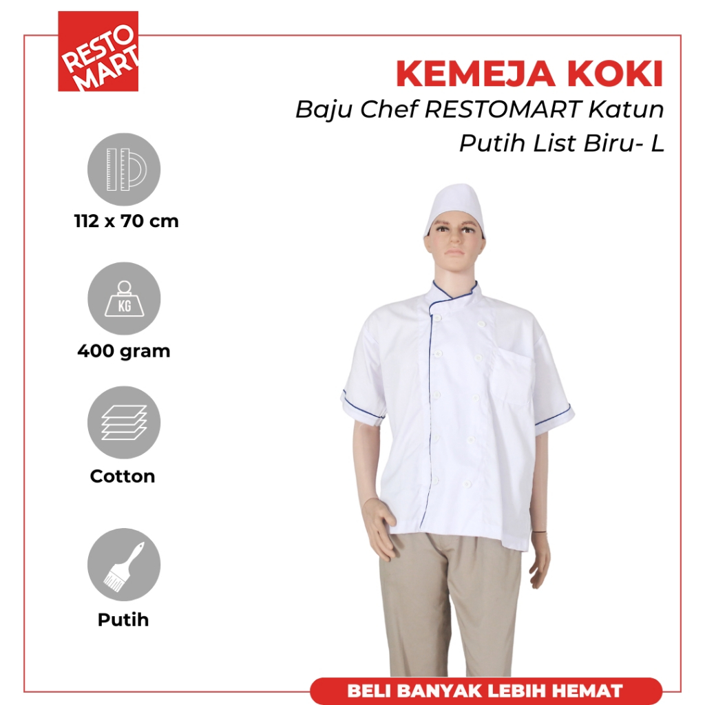 FLASH SALE Seragam Chef Baju Chef Kemeja Koki Lengan Pendek Putih + List Biru RESTOMART Katun Berkualitas (1394157) (1394158) (1