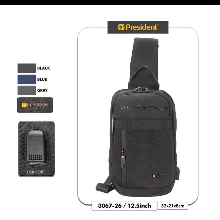 PRESIDENT 3067 3068 SLING BAG CROSSBODY BAG TAS SELEMPANG PRIA WANITA ORIGINAL - HITAM, PRESIDENT 89073/89071