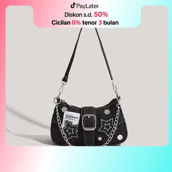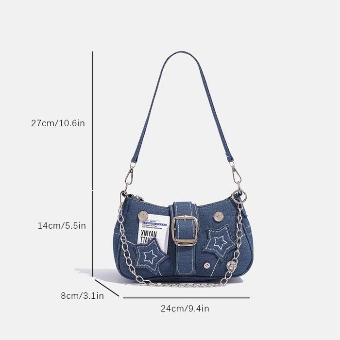 TAS BAHU TUNGGAL BINTANG DENIM TERBARU TREN FASHION DESAIN UNIK TAS BULAN SABIT KANVAS TAS TANGAN RANTAI TAS SELEMPANG C