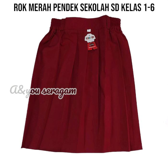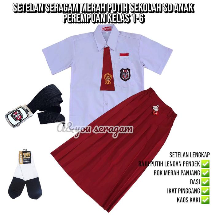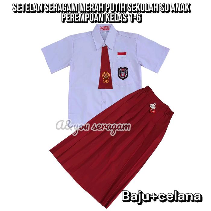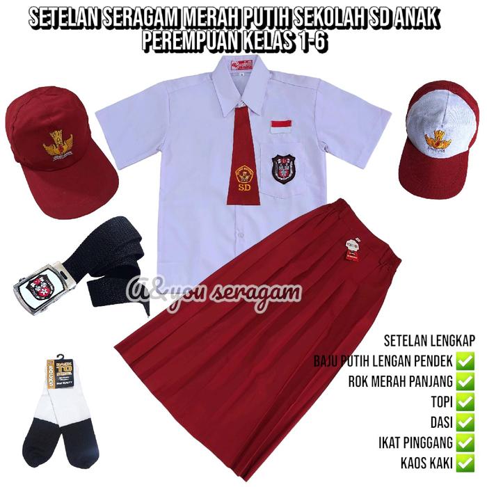 SETELAN SERAGAM MERAH PUTIH SEKOLAH SD ANAK PEREMPUAN BAJU PUTIH LENGAN PENDEK ROK MERAH PENDEK KELAS 1-6 - SET TOPI MER