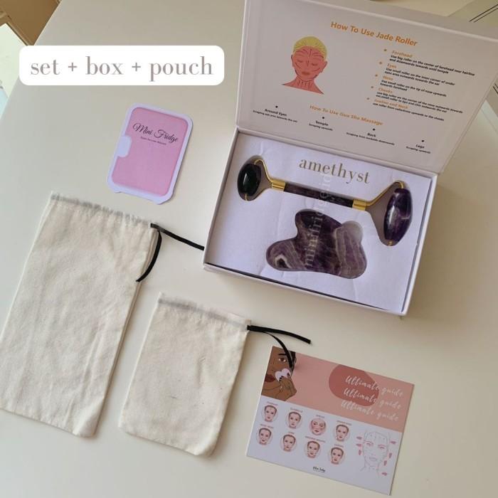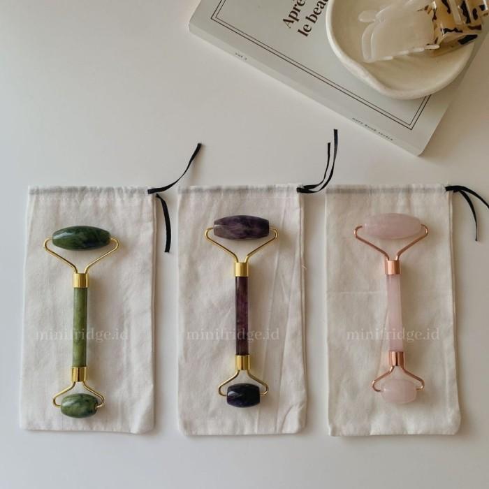 JADE ROLLER 2 SISI DAN GUASHA - ALAT PIJAT WAJAH FACIAL MASSAGE ROLLER - PINK ROLLER, POUCH