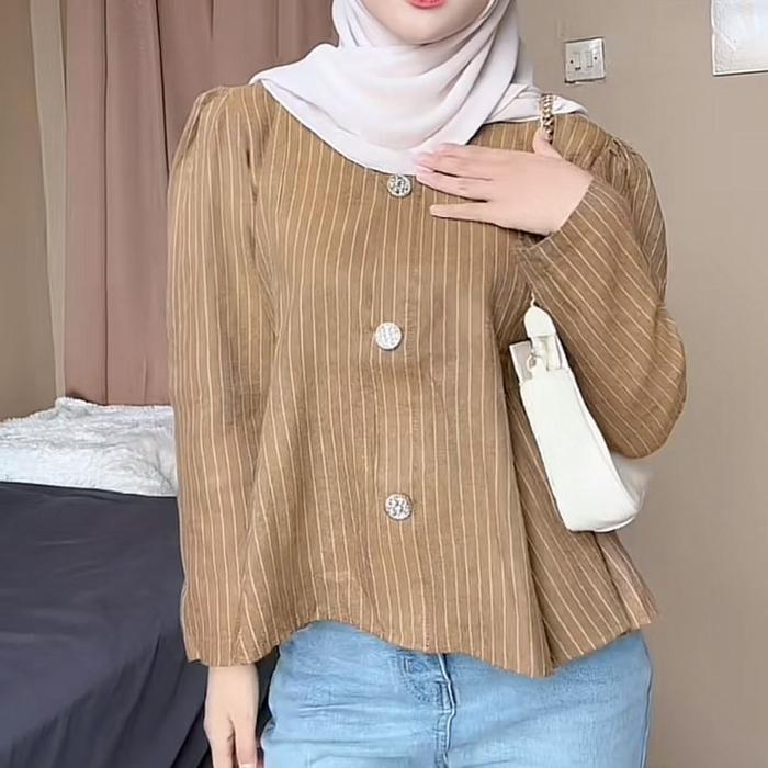 LBITZ- ARIKA BLOUSE STRIPE ATASAN WANITA PEPLUM BLOUSE LENGAN PUFF SALUR LENGAN PANJANG - CHOCO, S|M