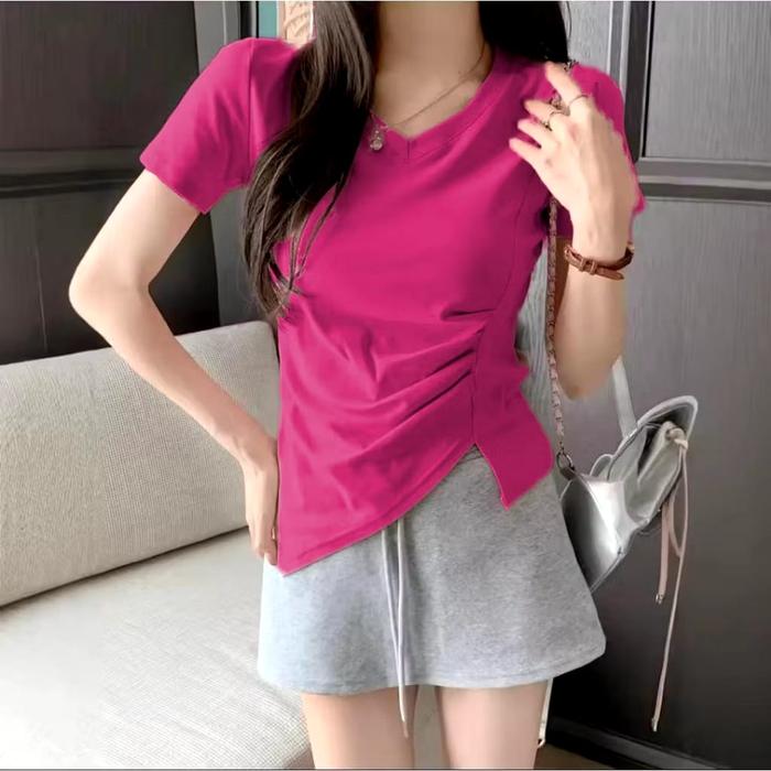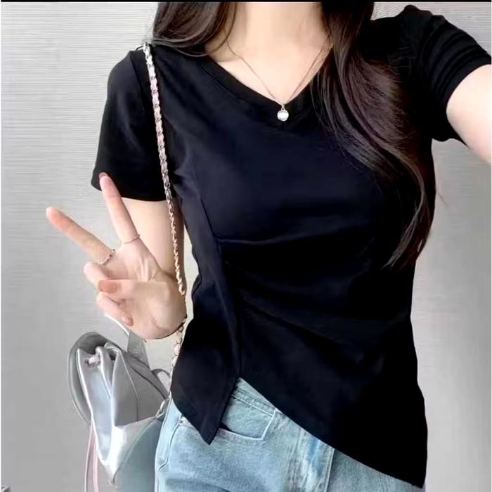 KAOS KOREA V-NECK LENGAN PENDEK LIPATAN SLIT ASIMETRIS SAMPING - KAOS KEKINIAN TERBARU - HITAM