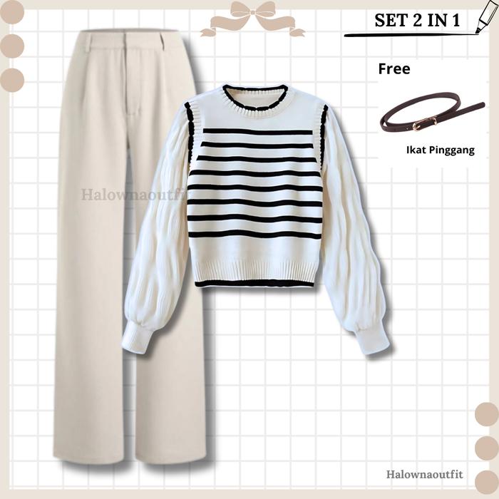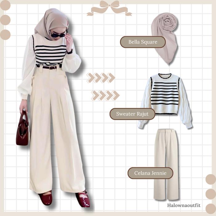 OOTD ONE SET RAJUT WANITA 3IN1 CELANA JENNIE KNIT + SWEATER STRIPE PUTIH + HIJAB BELLA SQUARE | FREE IKAT PINGGANG | SET