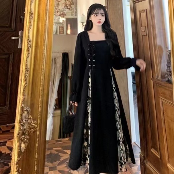 LONG DRESS MESH RETRO WOMEN SUMMER BLACK FLORAL DRESS MAXI DRESS HITAM- G039