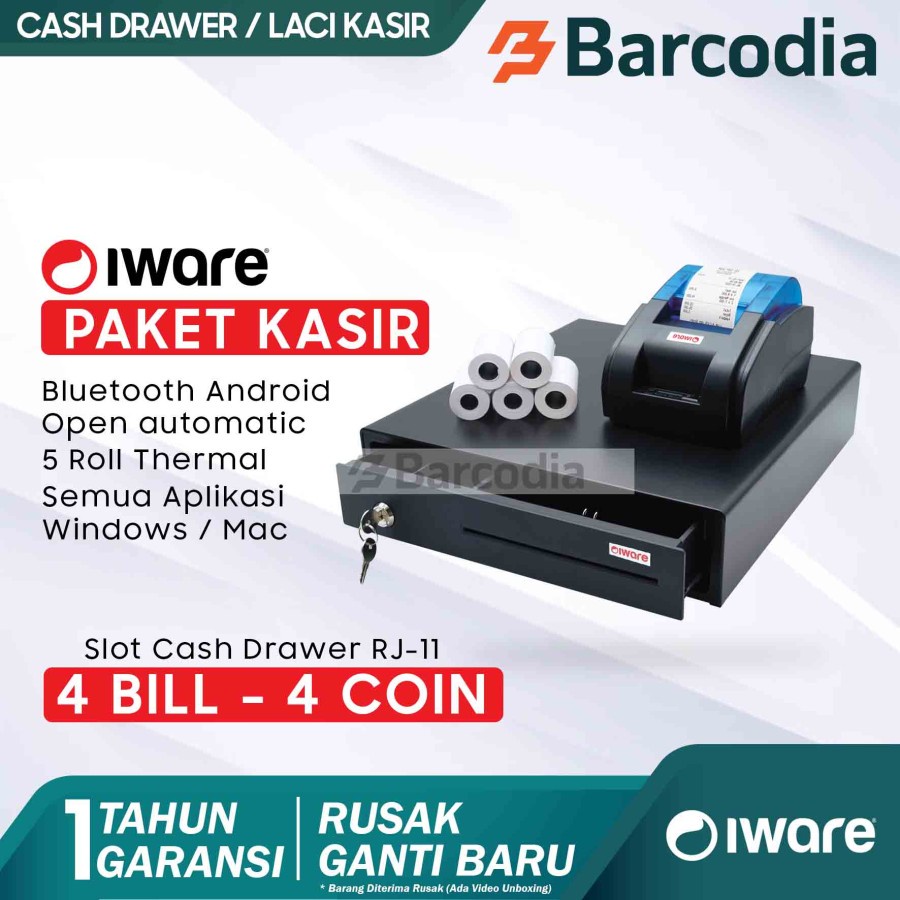 BARIA Paket Kasir Iware Cash Drawer + Printer Bluetooth + Kertas 5 Roll