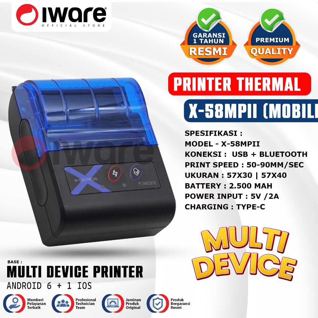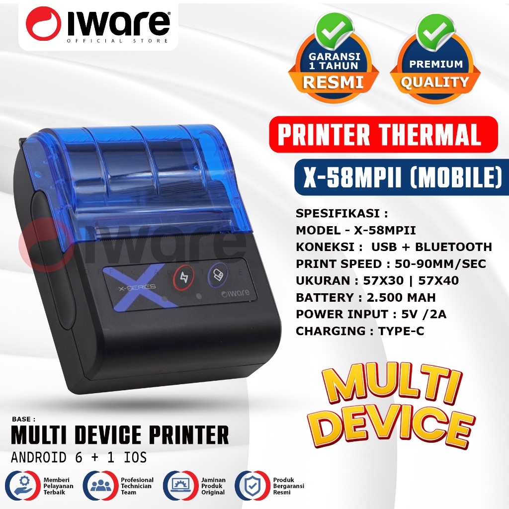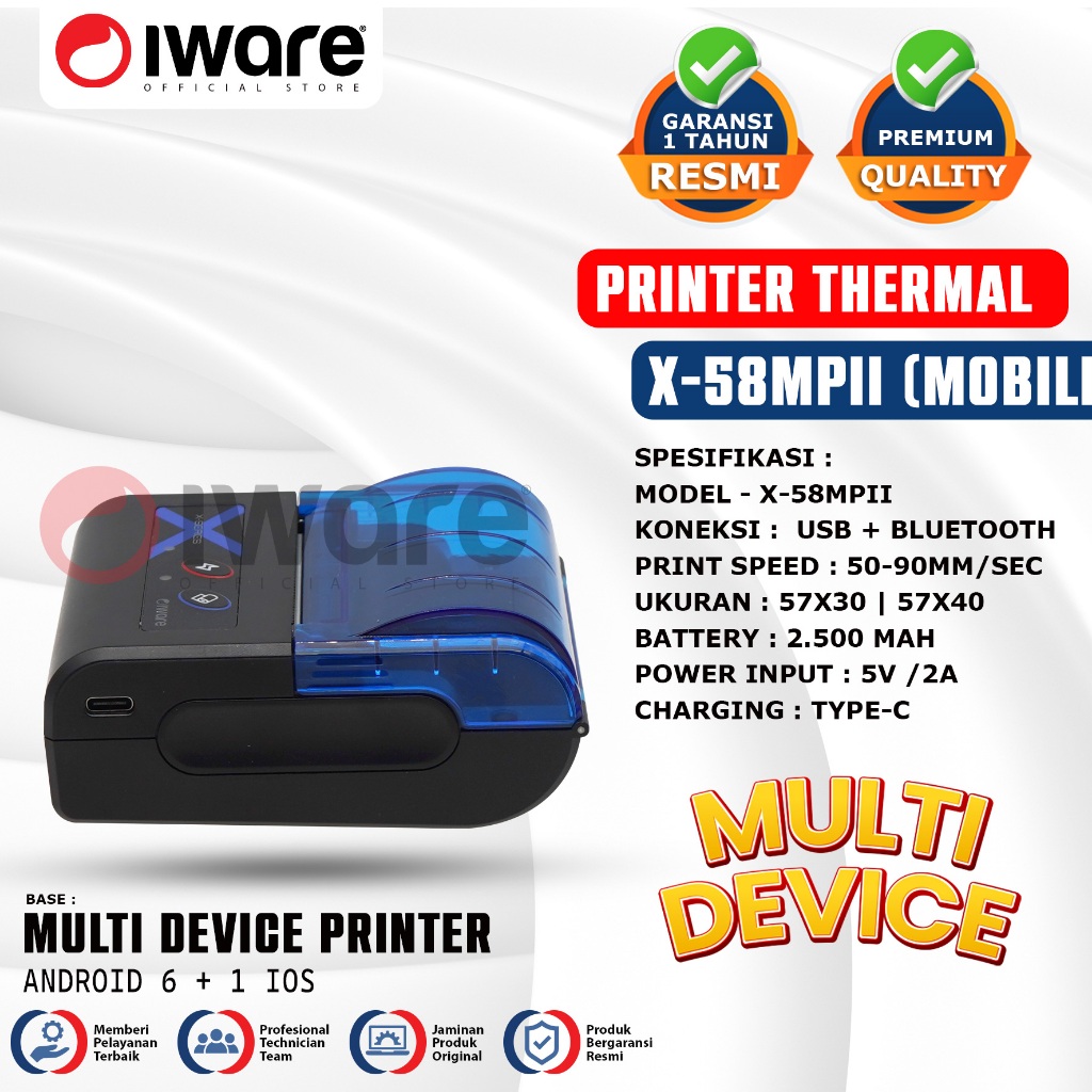 Iware Mobile Printer Thermal Struk Kasir PPOB RPP02N Multidevice X-Series X-58MPII 58mm Usb bluetooth Type-C 6 Android +