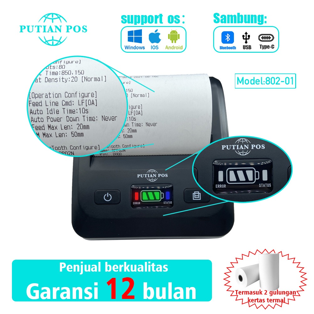 PUTIAN POS 80mm Mini Bluetooth Thermal Printer 802-01 Label Ticket, Mendukung Android Windows ios