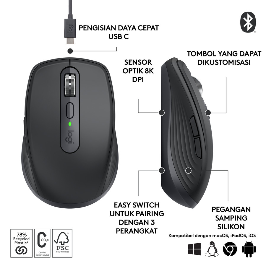 Logitech MX Anywhere 3S Mouse Wireless Bluetooth Silent Rechargeable