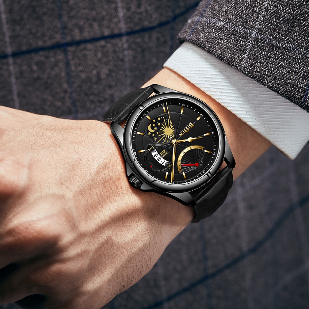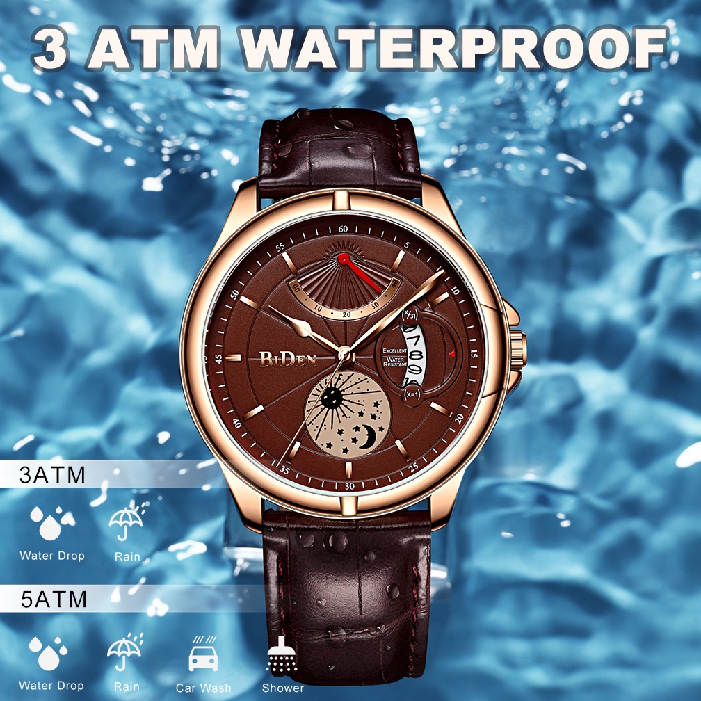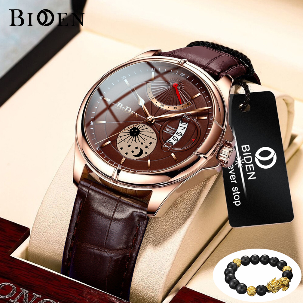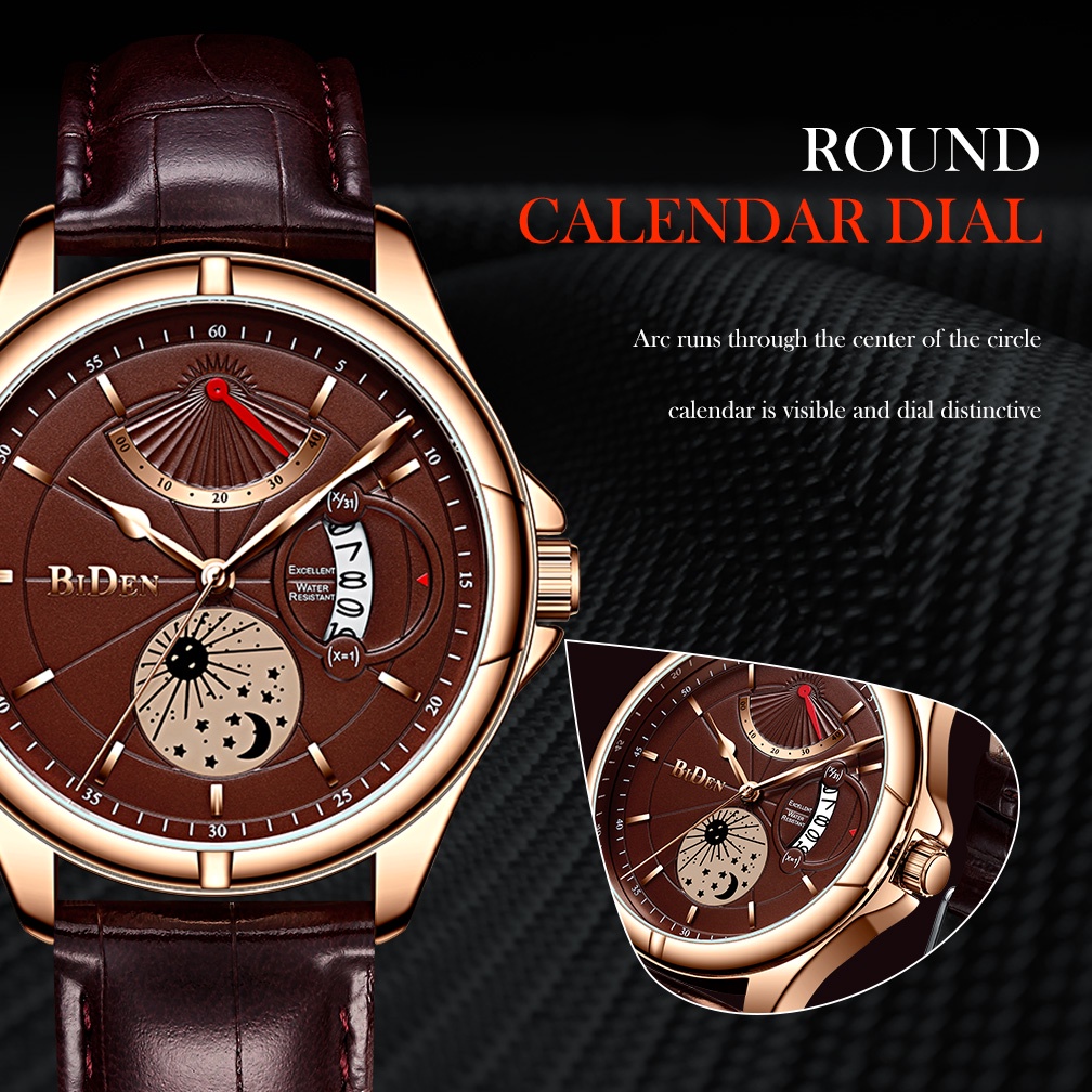 BIDEN Jam Tangan Pria Original Calendar Anti Air Pria Klasik Bisnis Tali Kulit Kuarsa Jam Tangan Cowok