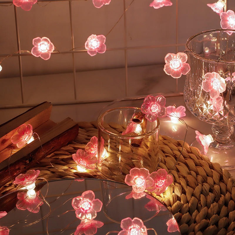 50 LED String Kamar Tidur Lentera Kecil Dekoratif Merah Muda Dekorasi Liburan Pernikahan USB Lampu Bunga Sakura