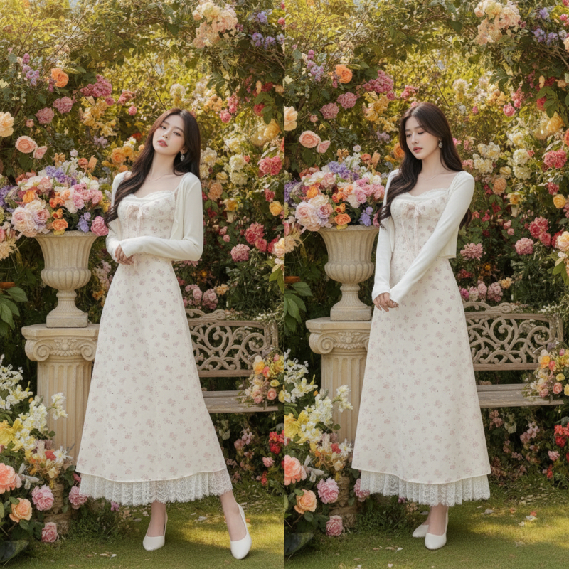 SETELAN LONG DRESS FLORAL VINTAGE RENDA LEMBUT STYLE KOREA - DRESS KOREA DRESS WANITA ELEGAN DRESS BUNGA K060