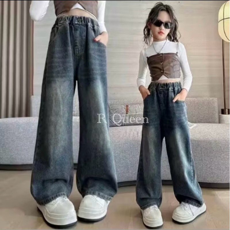 Celana Skena Jeans Anak Retro Wide Leg Whisker Lebar Gombrong Skena Biru Retro Black Wisker Pakaian Fashion Perempuan