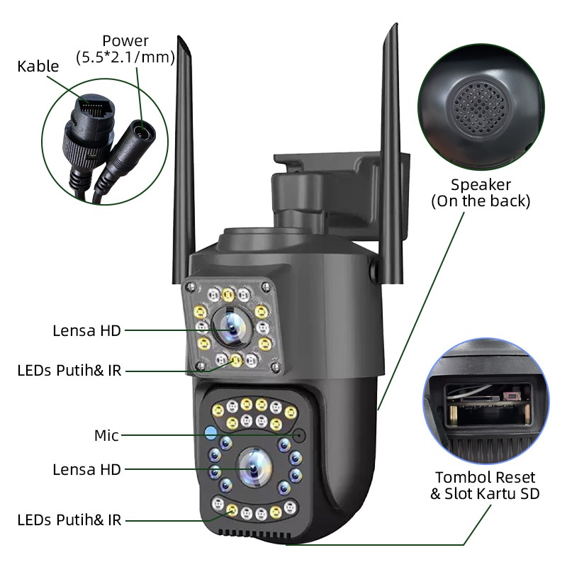 CCTV WiFi4G Outdoor Dual Lens Malam Jelas Tahan Hujan Audio Dua Arah Mudah Pasang Tanpa Biaya Bulanan