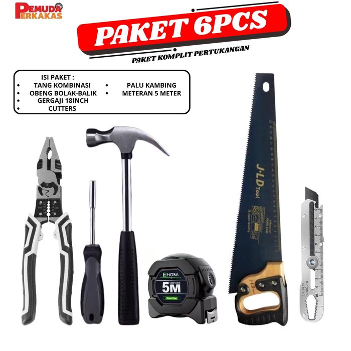 MURAH 1 SET PAKET GERGAJI GAGANG KAYU 18 INCH / GERGAJI DAN METERAN AUTO STOP DAN PALU KAMBING GERIGI 8OZ OBENG BOLAK BALIK TANG KOMBINASI CUTTER STAINLESS - PAKET 6 PCS