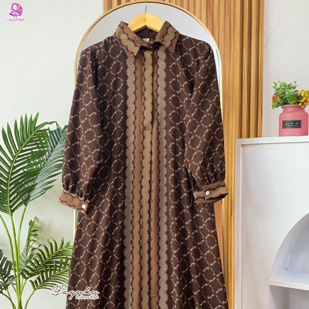 Malika Dress Gamis Kemeja Motif Monogram Elegan Bahan Premium Adem Nyaman Dipakai Seharian Look Mewah dan Simple Yayuku