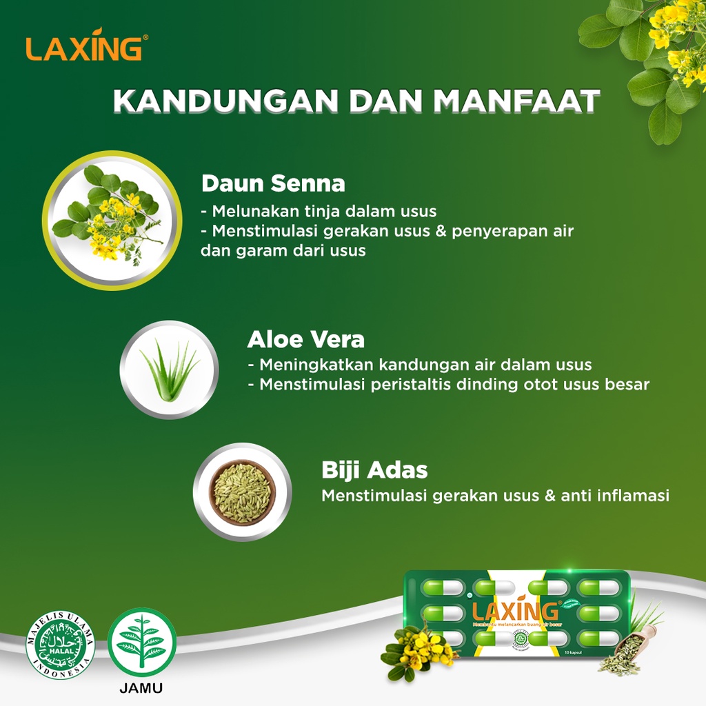 Laxing Pelancar Bab Herbal Alami Sembelit Begah Konstipasi 1 Box Isi 10 Blister BPOM HALAL TERLARIS